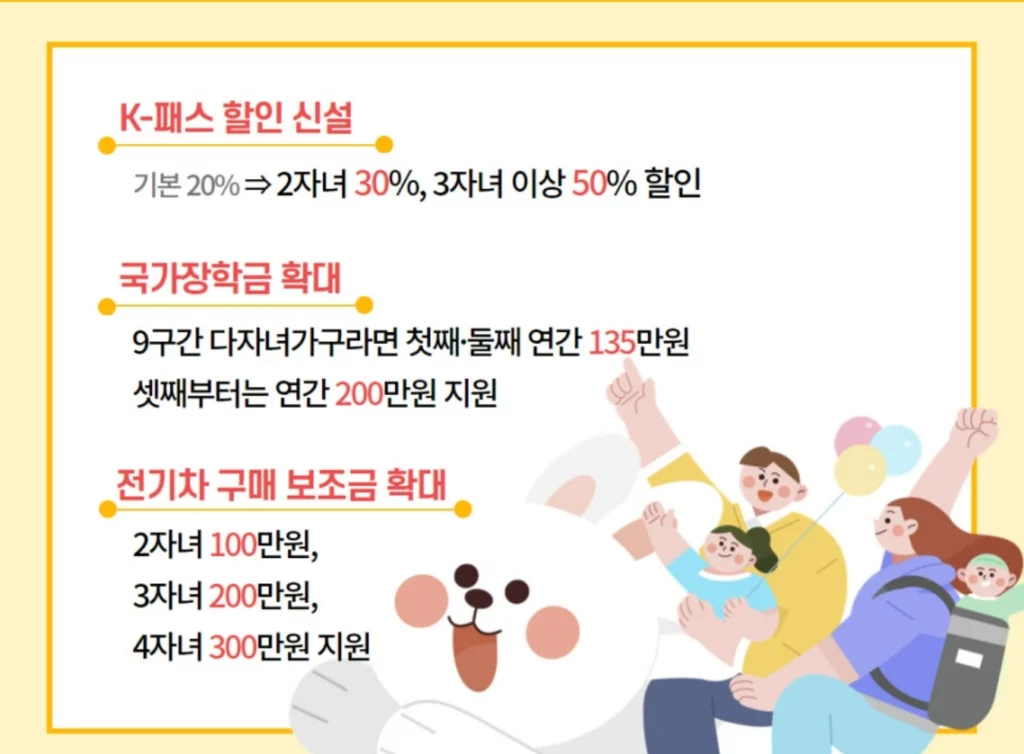 이 글에서 소개한 다자녀 세제 혜택, 교통 할인, 공공요금 감면, 지자체별 특별 지원 등 다양한 다자녀 혜택을 적극 활용하여 양육 부담을 덜고 자녀들에게 더 나은 환경을 제공하시기 바랍니다. 다자녀 가정의 행복한 미래를 응원합니다!